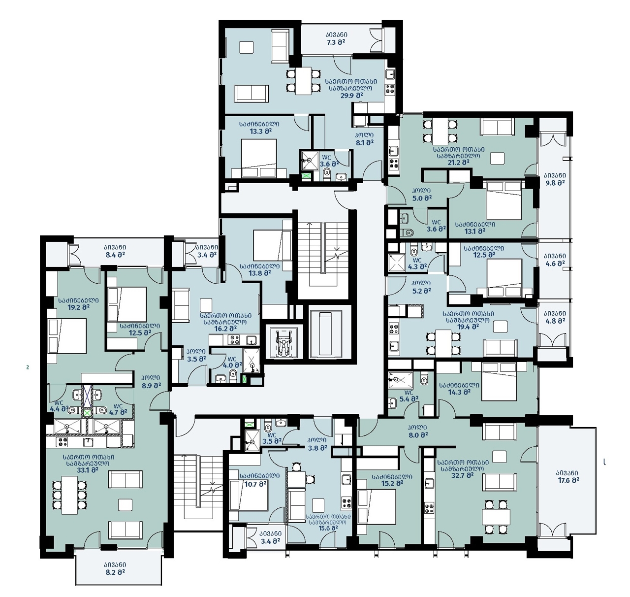 City Home Avlabari: 2-room apartment in 54.4 sq.m. | Korter.ge