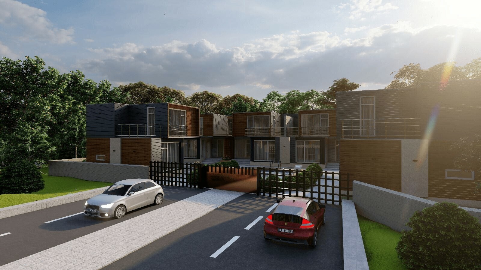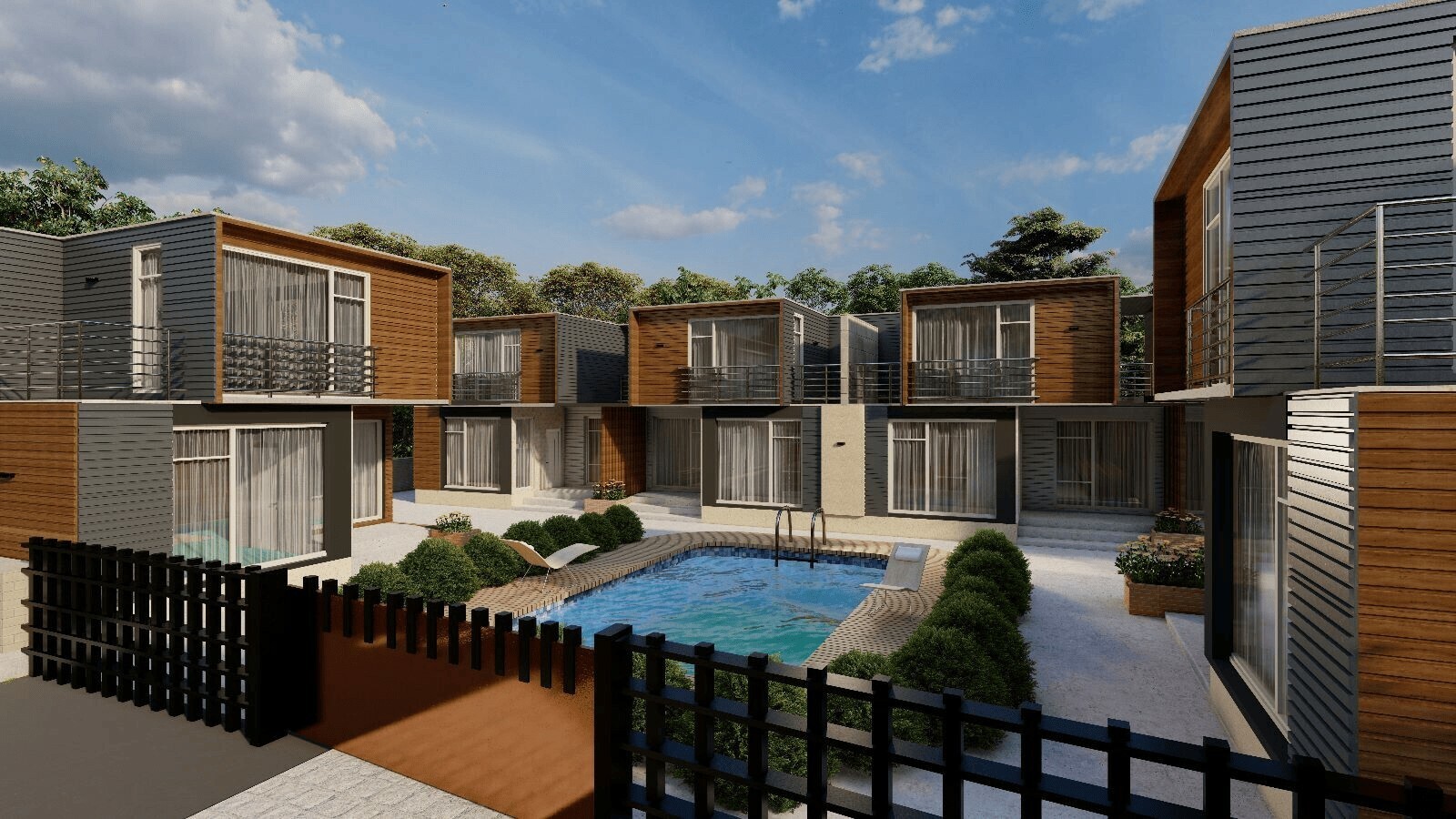 Warm wood tones on the facades are contrasted with elegant gray and light accents, creating a sense of strength and sophistication. Clean rooflines and geometric volumes emphasize clarity and rational design, while carefully designed windows and balconies bring softness, light, and balance.