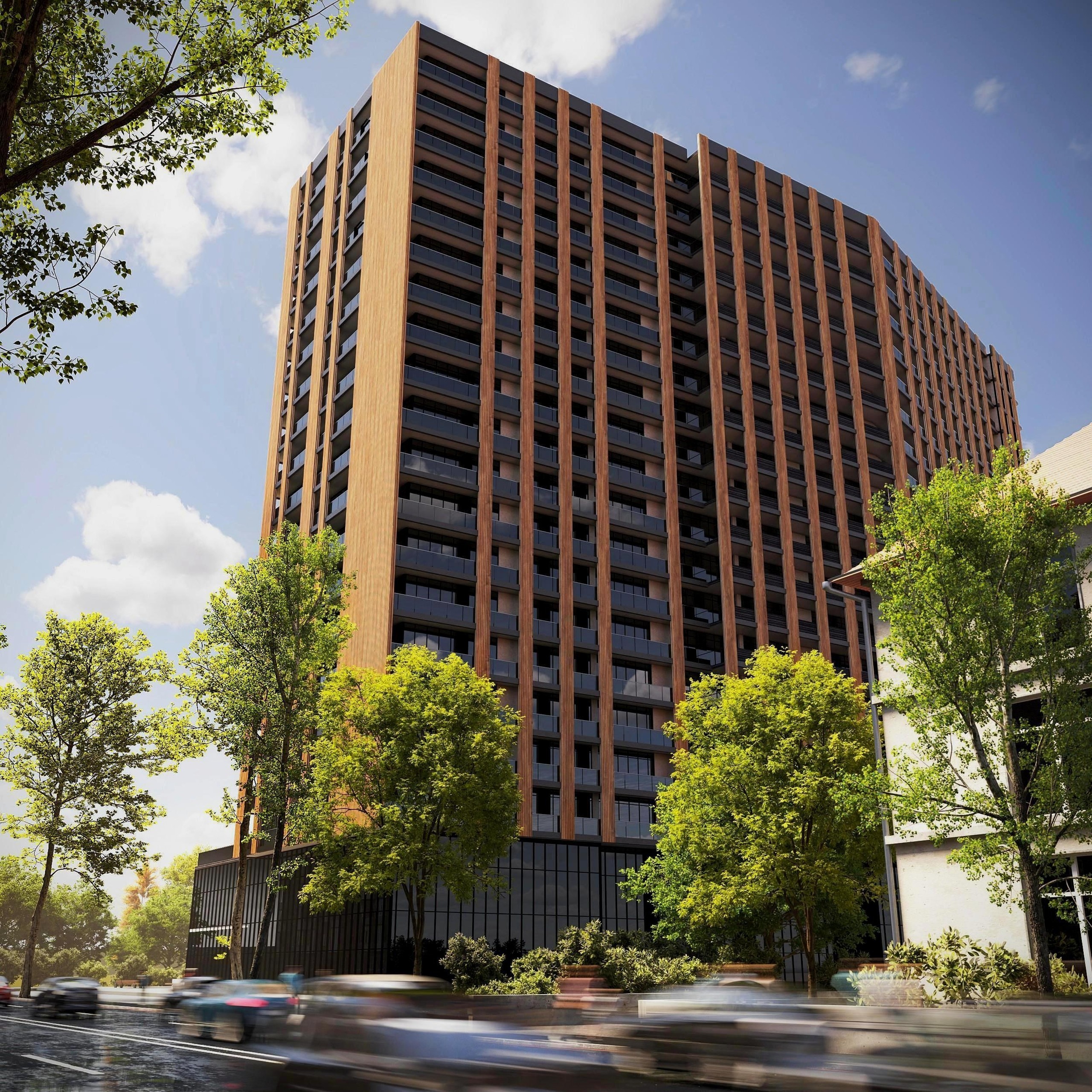 Особое внимание уделено вечерней подсветке фасада: система освещения выделяет структурные линии, подчёркивает текстуру панелей и выдвижные элементы балконов, создавая выразительный и заметный силуэт в городской ночной среде. В сочетании с деталями из металла и стекла подсветка формирует впечатляющую визуальную динамику, делая комплекс заметным ориентиром в районе.